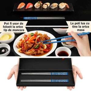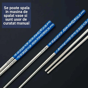 Bete chinezesti traditionale, set 2 pentru mancat, din otel inoxidabil, rezistente la spalare, cu imprimeuri florale colorate