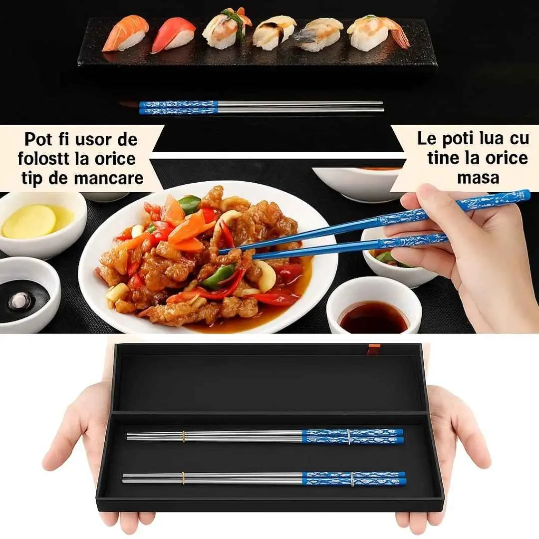 Descopera eleganta si practicitatea cu aceste bete Chinezesti de inalta calitate, realizate din titan durabil. Cu un design modern si un model atractiv, aceste bete adauga o nota sofisticata fiecarui moment de masa.