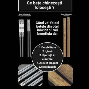 Descopera eleganta si functionalitatea acestui set de bete chinezesti traditionale, confectionate din otel inoxidabil durabil si decorate cu un model atragator din portelan rezistent la apa. Fie ca esti pasionat de bucataria asiatica sau vrei sa adaugi un element distinctiv la experienta ta culinara, aceste bete reutilizabile sunt alegerea perfecta. Cu 2 perechi incluse, vei putea impartasi aceasta experienta unica cu cei dragi. Investeste intr-un set durabil si stilat pentru a-ti imbunatati momentele de luat masa.