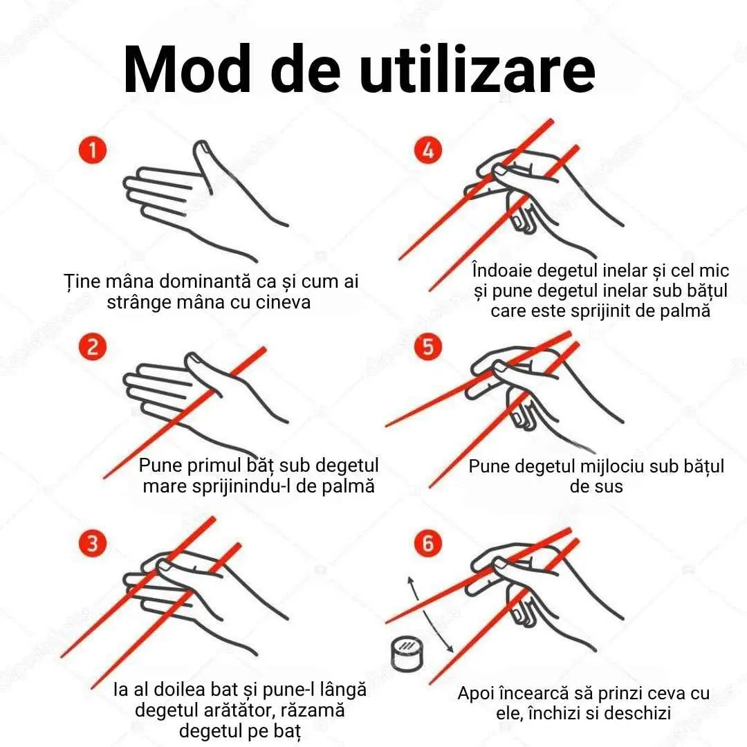 Prindere sigura: Forma ergonomica a betelor permite o prindere sigura si confortabila. Aceasta face ca manipularea mancarii sa fie mai usoara si mai precisa, indiferent daca este vorba de sushi, orez sau alte tipuri de mancare.