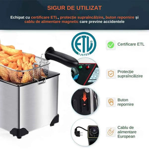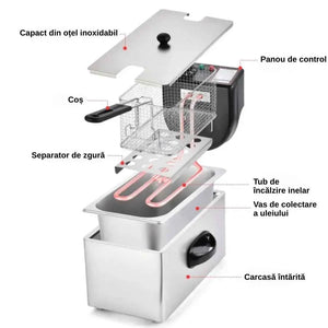 Friteuza Electrica cu Ulei, Material Inox, Capacitate 3,5L, Putere 2000W, Temperatura Reglabila 0 - 190 °C, Filtru Detasabil,Cos Detasabil, Protectie Impotriva Dupraincalzirii, Picioare Anti-Alunecare