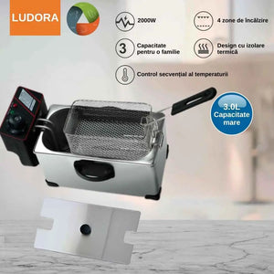 Friteuza cu ulei, cuva inox, capacitate 3L, putere 2000W, temperatura Reglabila 0 - 190 °C, filtru detasabil, cos detasabil, protectie impotriva supraincalzirii, picioare anti-alunecare