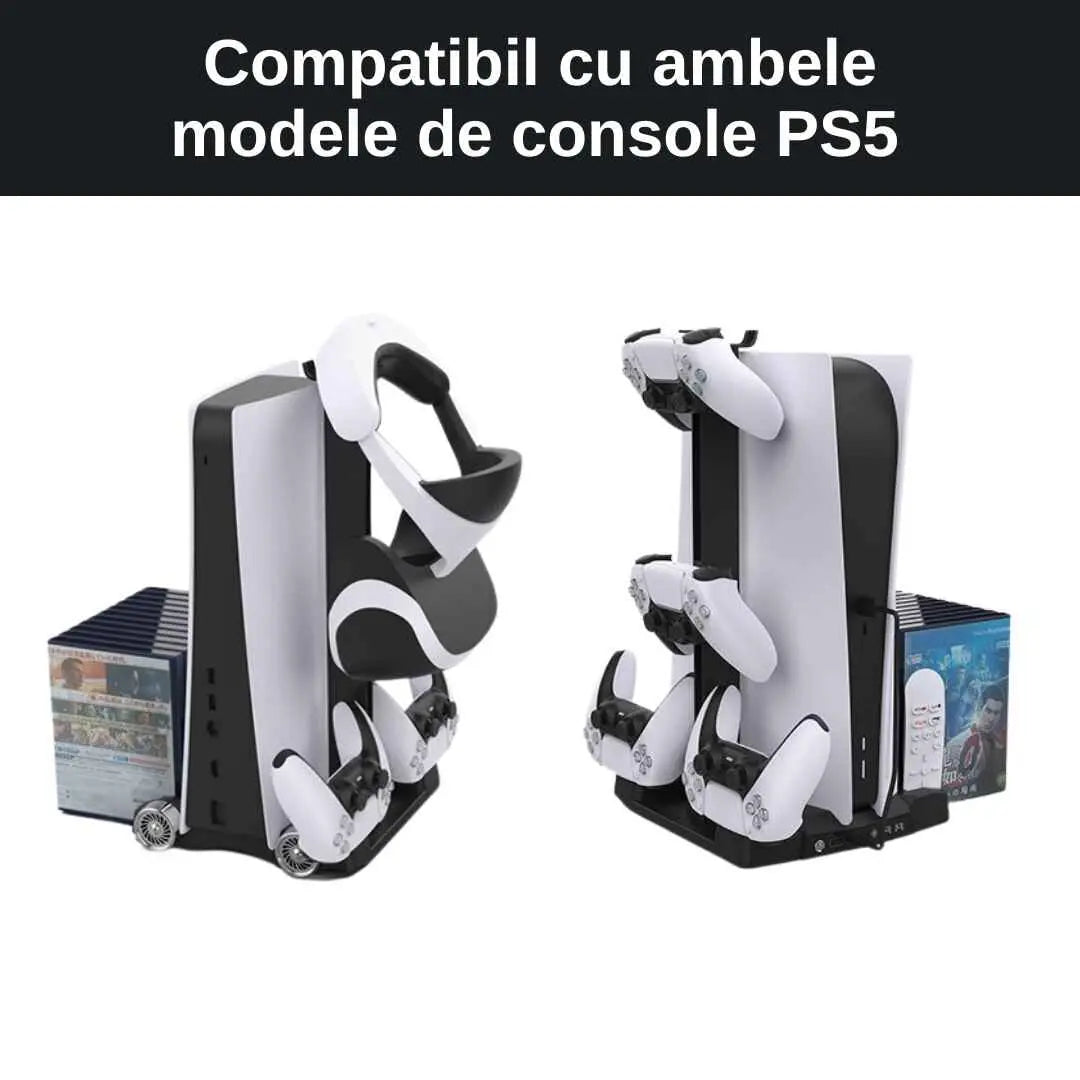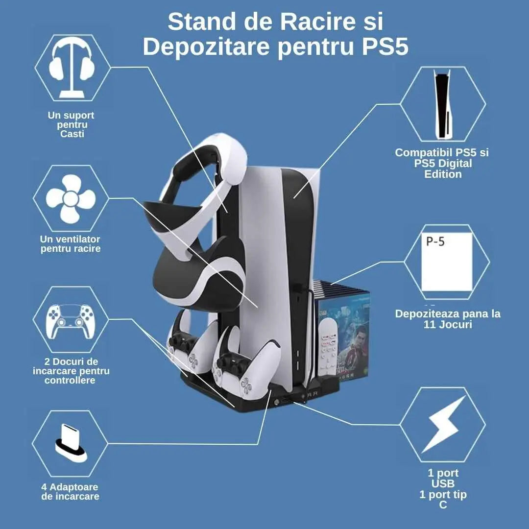 Stand racire PS5, vertical, multifunctional, Cu 2 porturi de incarcare controllere, suport casti, 11 sloturi spatiu depozitare jocuri, digiatal edition