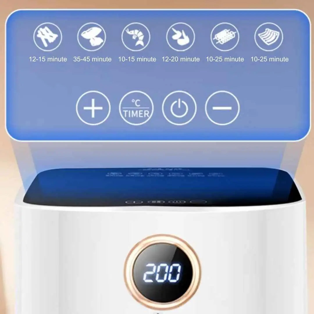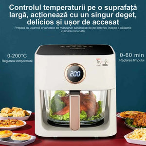 Friteuza cu aer cald, air frayer fara ulei, capacitate 5L, ecran tactil, recipent transparent din sticla borosilicata, putere 1200W, Temperatura reglabila 0-200°C, termomentru 60 Minute, cos detasabil, gatire rapida si uniforma