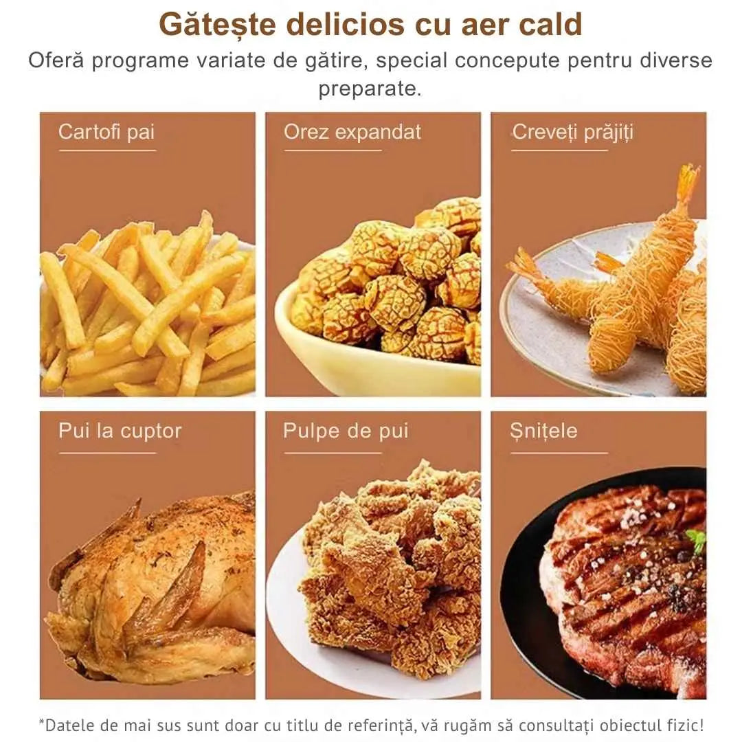 Descoperă o nouă experiență culinară cu această friteuză cu aer cald, echipată cu un vas generos de 5 litri din sticlă borosilicată transparentă – perfectă pentru a vizualiza în timp real preparate tale. Gătește sănătos, rapid și uniform ciclului 3D de aer cald și a temperaturii reglabile între 0–200°C. Cu funcții inteligente și presetări pentru diverse tipuri de alimente (cartofi pai, aripioare de pui, pește, creveți, friptură etc.), este ideală pentru familii sau pentru pasionații de gătit.