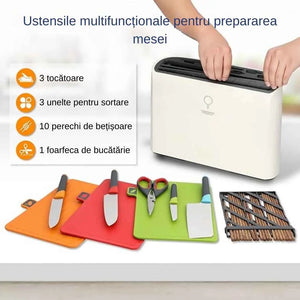 Acasă Set cutite profesionale plus aparat de sterilizat si depozitare, putere 50W, raze UV, sterilizare 99, 99%, uscare inteligenta, suport pentru cutite, 4 cutite si 1 foarfeca incluse, 3 tocatoare rezistente, 10 bete chinezesti