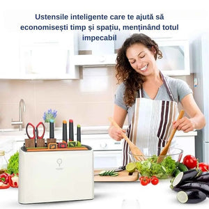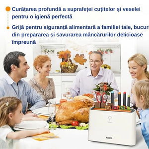 Vrei ca bucataria ta sa fie mereu curata si igienizata? Atunci ai nevoie de Aparatul de Sterilizat și Depozitat Cutite Profesional ! Cu ajutorul sterilizarii cu raze UV si uscarii inteligente, acest aparat elimina 99,99% din bacterii si mentine cutitele tale curate si ascutite pentru mai mult timp.