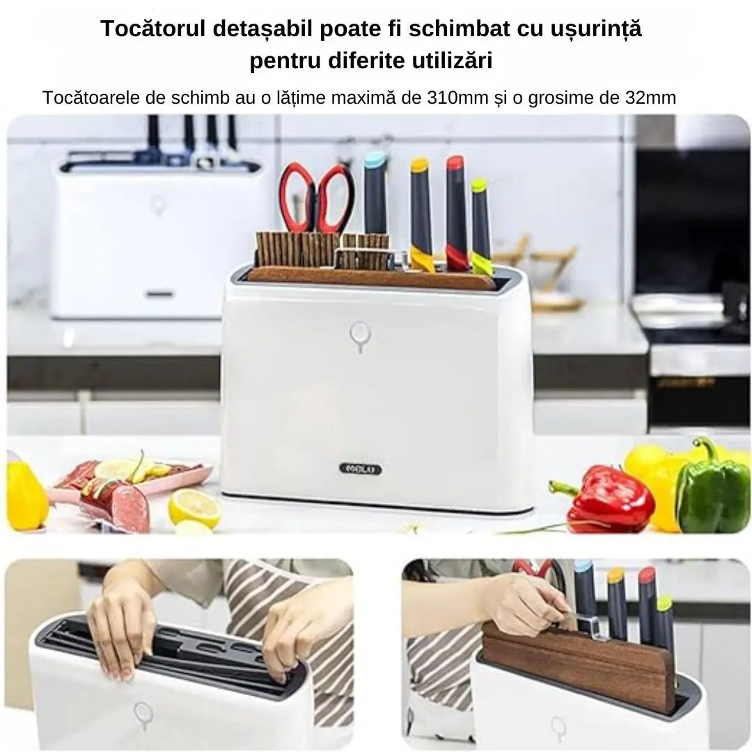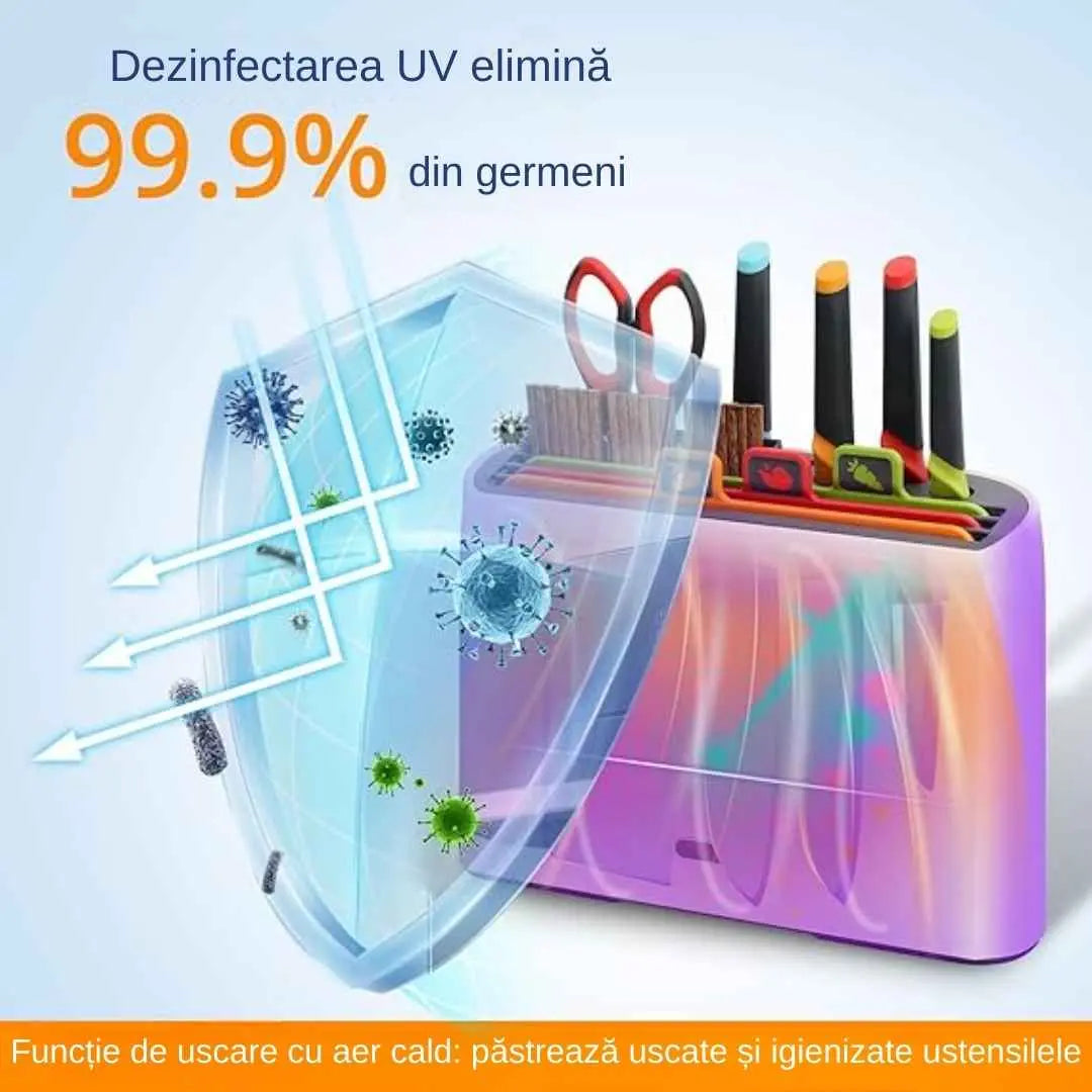 Aparat de sterilizat si depozitat cutite profesional, putere 50W, Cu raze UV, sterilizare 99,99%, cu uscare inteligenta, suport pentru cutite , 4 Cutite si 1 foarfeca incluse, 3 tocatoare rezistente, 10 bete chinezesti