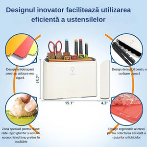 Depozitare organizata: Aparatul are un suport elegant pentru cutite care iti mentine cutitele organizate si la indemana.